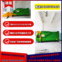 1、车厢可卸式垃圾车(勾臂式垃圾车)倒进垃圾中转站车位,卸下空的移动式垃圾压缩箱; 2、当从各处收集装满垃圾的三轮车、手推车进入垃圾中转站时,直接将垃圾倾倒进移动式压缩机料斗; 3、移动式垃圾压缩机将垃圾压缩后,污水在压缩过程中流出,经专门的收集装置收集流向沉沙井,经沉沙井沉淀后排入排污管道,到污水处理厂集中处理; 4、移动式垃圾压缩箱装满时会发出满箱信号,垃圾压缩机会自动停止压缩垃圾; 5、将汽车底盘倒进车位,钩起机箱,将垃圾运往垃圾处理场。 15立方移动式垃圾压缩机设备的特点 移动式垃圾压缩机设备具有环保、节能、减排! 1、15立方移动式垃圾压缩机设备采用PLC控制系统,有效提示设备出现的故障及对应解决方法,后门锁与密封结构,提高运输过程中不会发生二次污染(无遗撒、臭味、扬尘); 2、15立方移动式垃圾压缩机设备采用经济且减少污染的电力作为动力源,设备与运营成本低,确保设备运行可靠; 3、安装调试方便,无需土建或仅需建议土建,经济适用,就解决城市选址难题,适合各种生活垃圾的使收集与转运; 4、实现车箱分离,设备与转运站分离,机动灵活,便于管理协调,提高车辆与设备的利用率; 5,其控制方法分为手动和遥控两种方式,大大增加了操作人员的安全性。